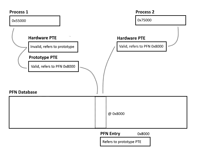 Nytro Posted August 15, 2017 Report Posted August 15, 2017 Exploring Windows virtual memory management August 13, 2017 In a previous post, we discussed the IA-32e 64-bit paging structures, and how they can be used to turn virtual addresses into physical addresses. They're a simple but elegant way to manage virtual address mappings as well as page permissions with varying granularity of page sizes. All of which is provided by the architecture. But as one might expect, once you add an operating system like Windows into the mix, things get a little more interesting. The problem of per-process memory In Windows, a process is nothing more than a simple container of threads and metadata that represents a user-mode application. It has its own memory so that it can manage the different pieces of data and code that make the process do something useful. Let's consider, then, two processes that both try to read and write from the memory located at the virtual address 0x00000000`11223344. Based on what we know about paging, we expect that the virtual address is going to end up translating into the same physical address (let's say 0x00000001`ff003344 as an example) in both processes. There is, after all, only one CR3 register per processor, and the hardware dictates that the paging structure root is located in that register. Figure 1: If the two process' virtual addresses would translate to the same physical address, then we expect that they would both see the same memory, right? Of course, in reality we know that it can't work that way. If we use one process to write to a virtual memory address, and then use another process to read from that address, we shouldn't get the same value. That would be devastating from a security and stability standpoint. In fact, the same permissions may not even be applied to that virtual memory in both processes. But how does Windows accomplish this separation? It's actually pretty straightforward: when switching threads in kernel-mode or user-mode (called a context switch), Windows stores off or loads information about the current thread including the state of all of the registers. Because of this, Windows is able to swap out the root of the paging structures when the thread context is switched by changing the value of CR3, effectively allowing it to manage an entirely separate set of paging structures for each process on the system. This gives each process a unique mapping of virtual memory to physical memory, while still using the same virtual address ranges as another process. The PML4 table pointer for each user-mode process is stored in the DirectoryTableBase member of an internal kernel structure called the EPROCESS, which also manages a great deal of other state and metadata about the process. Figure 2: In reality, each process has its own set of paging structures, and Windows swaps out the value of the CR3 register when it executes within that process. This allows virtual addresses in each process to map to different physical addresses. We can see the paging structure swap between processes for ourselves if we do a little bit of exploration using WinDbg. If you haven't already set up kernel debugging, you should check out this article to get yourself started. Then follow along below. Let's first get a list of processes running on the target system. We can do that using the !process command. For more details on how to use this command, consider checking out the documentation using .hh !process. In our case, we pass parameters of zero to show all processes on the system. 0: kd> !process 0 0 **** NT ACTIVE PROCESS DUMP **** PROCESS fffffa801916b5d0 SessionId: none Cid: 0004 Peb: 00000000 ParentCid: 0000 DirBase: 00187000 ObjectTable: fffff8a000001890 HandleCount: 560. Image: System PROCESS fffffa8028effb10 SessionId: none Cid: 0130 Peb: 7fffffd8000 ParentCid: 0004 DirBase: 7d9ed5000 ObjectTable: fffff8a000174d80 HandleCount: 36. Image: smss.exe PROCESS fffffa802949bb10 SessionId: 0 Cid: 01b8 Peb: 7fffffdf000 ParentCid: 0174 DirBase: 7cf890000 ObjectTable: fffff8a000b82010 HandleCount: 713. Image: csrss.exe ... PROCESS fffffa8019218b10 SessionId: 1 Cid: 02f0 Peb: 7fffffd5000 ParentCid: 0808 DirBase: 652e89000 ObjectTable: fffff8a00cacc270 HandleCount: 58. Image: notepad.exe view raw tf-article2-windbg-1.txt hosted with ❤ by GitHub We can use notepad.exe as our target process, but you should be able to follow along with virtually any process of your choice. The next thing we need to do is attach ourselves to this process - simply put, we need to be in this process' context. This lets us access the virtual memory of notepad.exe by remapping the paging structures. We can verify that the context switch is happening by watching what happens to the CR3 register. If the virtual memory we have access to is going to change, we expect that the value of CR3 will change to new paging structures that represent notepad.exe's virtual memory. Let's take a look at the value of CR3 before the context switch. 0: kd> r cr3 cr3=000000078b07a000 view raw tf-article2-windbg-2.txt hosted with ❤ by GitHub We know that this value should change to the DirectoryTableBase member of the EPROCESS structure that represents notepad.exe when we make the switch. As a matter of interest, we can take a look at that structure and see what it contains. The PROCESS fffffa8019218b10 line emitted by the debugger when we listed all processes is actually the virtual address of that process' EPROCESS structure. 0: kd> dt nt!_EPROCESS fffffa8019218b10 -b +0x000 Pcb : _KPROCESS +0x000 Header : _DISPATCHER_HEADER +0x000 Type : 0x3 '' +0x001 TimerControlFlags : 0 '' +0x001 Absolute : 0y0 +0x001 Coalescable : 0y0 +0x001 KeepShifting : 0y0 +0x001 EncodedTolerableDelay : 0y00000 (0) +0x001 Abandoned : 0 '' +0x001 Signalling : 0 '' +0x002 ThreadControlFlags : 0x58 'X' +0x002 CpuThrottled : 0y0 +0x002 CycleProfiling : 0y0 +0x002 CounterProfiling : 0y0 +0x002 Reserved : 0y01011 (0xb) +0x002 Hand : 0x58 'X' +0x002 