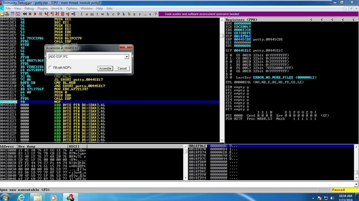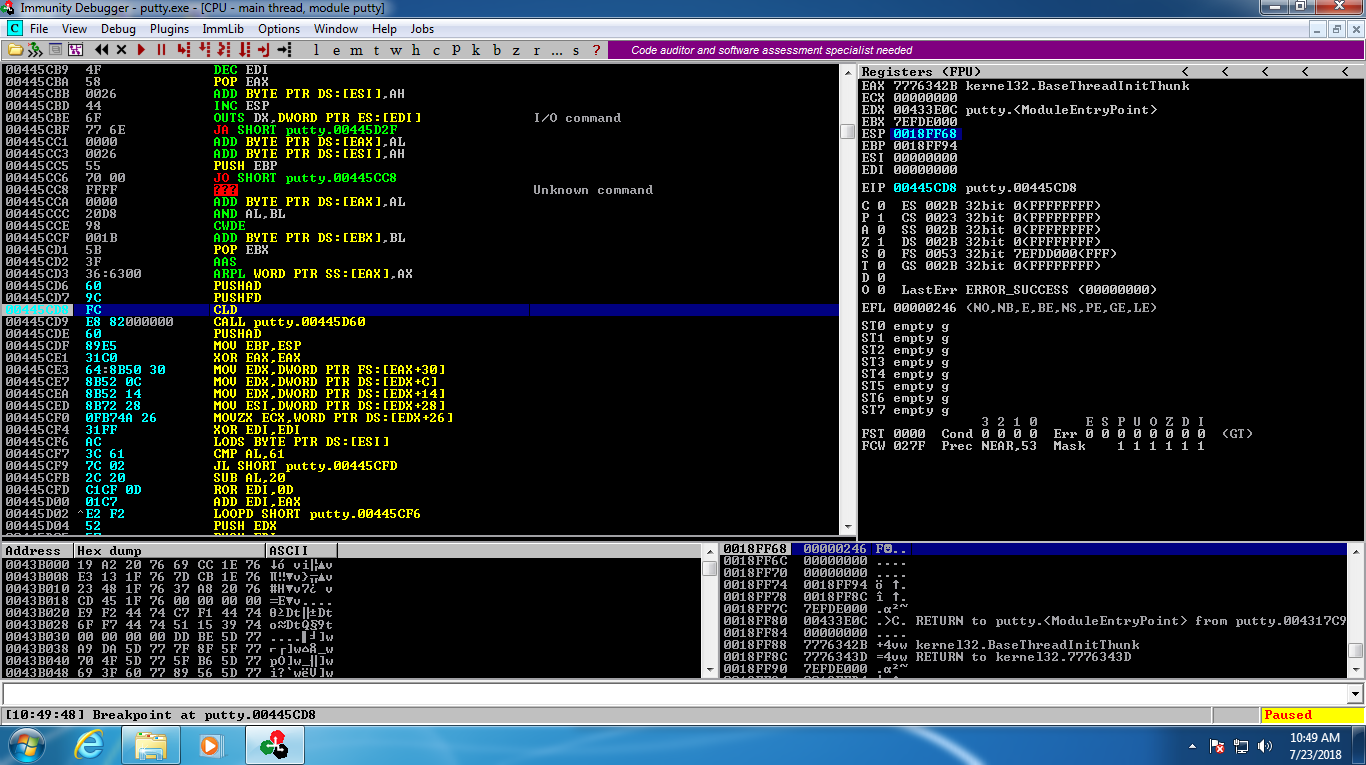 Nytro Posted July 30, 2018 Report Posted July 30, 2018 Backdoring PE files using code caves : OSCE/CTP Module 0x03 July 24, 2018 Hello Readers, This post will cover Backdooring of P.E file by using code caves . There are already good tools to do this for you eg. Backdoor Factory and Shelter which will do the same job and even bypass some static analysis of few antiviruses . I will be covering the manual approach of backdooring a PE file . Let's understand some terms : [x] PE file : The Portable Executable (PE) format is a file format for executables, object code, and DLLs, used in 32-bit and 64-bit versions of Windows operating systems. [x] Code Cave : Wikipedia says - "A code cave is a series of null bytes in a process's memory. The code cave inside a process's memory is often a reference to a section of the code’s script functions that have capacity for the injection of custom instructions. For example, if a script’s memory allows for 5 bytes and only 3 bytes are used, then the remaining 2 bytes can be used to add external code to the script." [x] Shellcode : Wikipedia - "A shellcode is a small piece of code used as the payload in the exploitation of a software vulnerability. It is called "shellcode" because it typically starts a command shell from which the attacker can control the compromised machine, but any piece of code that performs a similar task can be called shellcode." Let's get started .... You can download the Putty version which I have used from here . I will be using Immunity Debugger for debugging purposes.You can use any other debugger like Ollydbg. First we need to find the available code cave spaces where we can insert our malicious code.You can either add a section or modify an existing section and use the available code cave spaces. I have used cave-miner script to locate available unused bytes. Okey, so cave begins from 00445CD5. I will inject my shellcode from 00445CD6. I will be hijacking the entry point of the program and redirect the execution flow to our shellcode. First of all , we have to make .data section executable using Lord P.E or any P.E header editor tool. Once it is done , we need to copy the first few instructions of the entry point and save it somewhere in notepad. Insert the first instruction as JMP 00445CD6 which will help in redirection of the execution flow to our newly discovered code cave space. Once the entry point instructions are replcaed by JMP instruction then we need to note down what instructions are overwritten and those need to be restore later. Now , let's understand the backdoor part - 1. PUSHAD 2. PUSHFD 3. Shellcode 4. Stack Allignment 5. POPFD 6. POPAD 7. RETORE instructions 8. JMP to next instruction PUSHAD instruction is equivilent to writing: Push EAX Push ECX Push EDX Push EBX Push ESP Push EBP Push ESI Push EDI POPAD pops the values back off the stack in reverse order, thus restoring all the register values. PUSHAD and POPAD are useful for performing a easy save and restore of the general purpose registers without having to PUSH and POP every individual register in turn. Similarly, PUSHFD and POPFD are used to save and restore the EFLAGS register. Generate a reverse tcp shellcode from msvenom in hex format and Binary paste in code cave space after PUSHFD instruction. Note down ESP value before shellcode execution and after shellcode execution for finding the difference and aligning the stack. Before shellcode - After shellcode - Difference = 0018FF68 - 0018FD6C Now allign stack by adding this value to esp . After restoring save the newly modified executable and listen on netcat for reverse connection. As soon as I started putty,it got stuck and didn't open until I closed the reverse connection . This is due to a function called WaitforSingleObject used in msfvenom shellcodes. Here is a nice article on the same and how to fix this - https://simonuvarov.com/msfvenom-reverse-tcp-waitforsingleobject/ Msfvenom shellcode uses INFINITE as a value for the dwMilliseconds parameter. Fixing the waitforsingleobject problem by making dwMilliseconds parameter value to 0 from -1(due to dec esi instruction which I replaced using NOP) - Once It is fixed save the executable and you are good to Go .. !!!!!!!!!!!!!!!! POC- As soon as I open putty.exe it gave a reverse shell and at the same time working perfectly like a charm. Thanks for reading ..Happy Hacking .. Sursa: http://www.theanuragsrivastava.in/2018/07/backdoring-pe-files-using-code-caves.html?m=1 Quote