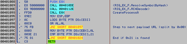 Nytro Posted December 3, 2014 Report Posted December 3, 2014 RIG Exploit Kit - Shellcode analysis Brad published a traffic analysis exercise which I had a quick look at and felt that I wanted to take it to the next level so I started looking at how to decode the payload delivered by the exploit kit.I get the shellcode from the Flash exploit as it's provided as a hex-encoded string starting with "90909090" (NOP): An easy way to go is to create an executable from the shellcode utilizing Shellcode2Exe to be able to step through it in OllyDbg.Taking the step into shellcodeLoading it up in Olly, it will start with a loop which decodes the payload URL using XOR as seen below. The key can be found by inspecting ESI when first hitting the loop and the encoded data can be found by inspecting EDI. After decoding: The decoding loop will continue until the decoded byte is "!" (0x21), the reason will be explained later in the post under "Multiple payloads".The shellcode uses URLDownloadToCacheFileA to download the payload. Should the payload be successfully downloaded, it will be opened with CreateFileA and read with ReadFile into memory allocated using VirtualAlloc.After reading the file it will be decrypted using RC4 cipher with a key defined in the shellcode. I recommend reading the post from VRT on how to recognize RC4 when debugging. This is the function found in the shellcode: Inspecting EDI when hitting the above lines it's found to have the following content: EDI is pointing to the first byte of the key and EBP holds the key length which is 5 giving the key m3S4V. At this point it's possible to let the shellcode run until CloseHandle is called and the decoded payload has been written back to disk or write a script for decoding the payload extracted from the PCAP. A small implementation of the RC4 cipher can be found here (Python).Multiple payloadsWhat is the most interesting thing about the shellcode is that it carries more functionality than isn't used. The shellcode is used to download one payload, but the shellcode supports multiple payloads. After calling CreateProcessA, the shellcode will step through the recently used URL looking for the end of the string (0x00), and comparing the next byte with "!" (0x21). If it's true, the shellcode will end otherwise it will start over with a new payload. An example of URL-list would look like this:<url1>0x00<url2>0x00<urlN>0x0021 Conclusion of sortsRIGs shellcode have the capability to download and execute multiple payloads which are encrypted using RC4 (5 byte key). The URL-list is encoded using XOR (5 byte key).API-calls used in the shellcode (in order of first call):- LoadLibraryA - URLDownloadToCacheFileA- CreateFileA- VirtualAlloc - ReadFile- SetFilePointer- WriteFile- VirtualFree - CloseHandle - CreateProcessAYou can find the hex-encoded shellcode on [pastebin]. Upplagd av teh syntx kl. 11:57 Sursa: tHEMbITS: RIG Exploit Kit - Shellcode analysis Quote